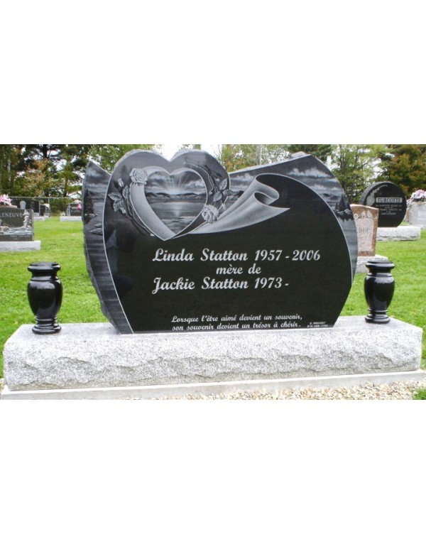 Ce monument funéraire a été conçu pour offrir design et classe, taillé dans granit noir de première qualité, il expose un paysage à couper le souffle de montagnes et dun magnifique lac le tout agrémenté dun parchemin et dun cœur style médaillon. Sa façade polie et ses côtés bosselés en font une pièce unique pour un être cher qui létait tout autant.