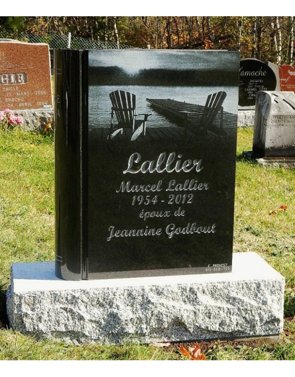 Ce somptueux monument funéraire est taillé dans un granit noir, à la forme dun livre, il évoque lhistoire, avec son paysage des plus magnifiques cela fait de lui une unicité en soi. Ce monument funéraire vous est offert entièrement poli