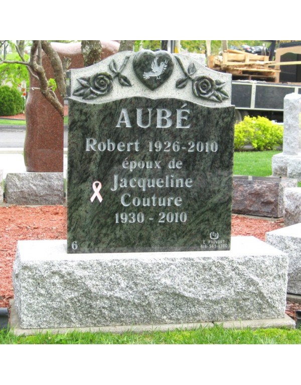 Magnifique monument de couleur vert mettant en vedette une belle gerbe de rose de finition polie.
