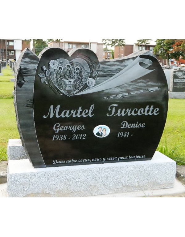 De forme innovatrice alliant nouveauté et classe, ce monument de granit noir plaira à tous autant par son design que limage produite à la main, un coup de coeur assuré.
