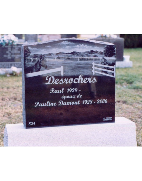 Ce monument funéraire à la couleur noire, vous offre une magnifique scène de chevaux en pleine nature, cette gravure au burin est faite sur une surface qui au préalable a été poli et nous avons conservé les pourtours du monument funéraire à létat brut afin dapprécier la splendeur du dessin.