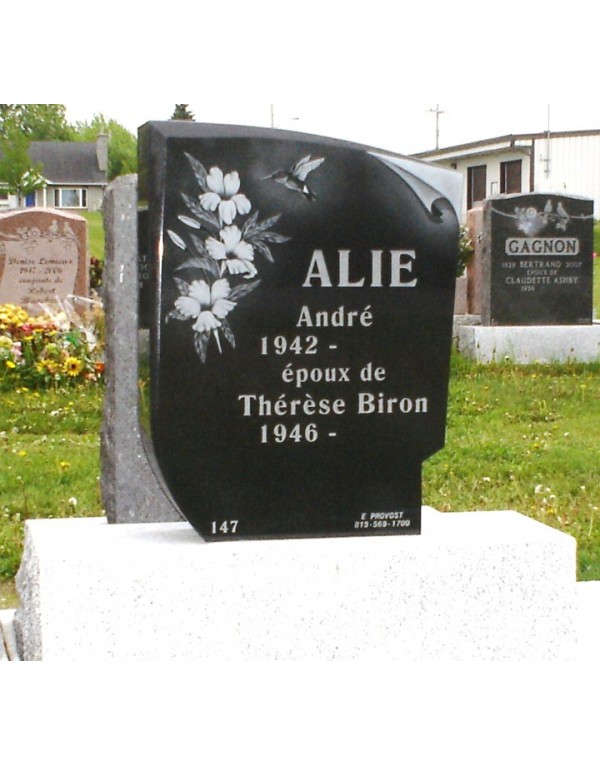 Ce monument funéraire allie sobriété et classe, offert dans un granit de couleur noir, une forme qui sort de lordinaire et une surface entièrement polie. Ce monument a été gravé à la main afin de vous offrir une magnifique gerbe de fleur avec un oiseau mouche à la recherche de nectar. Avec les moindres détails de cette oeuvre cest comme si elle prenait vie.