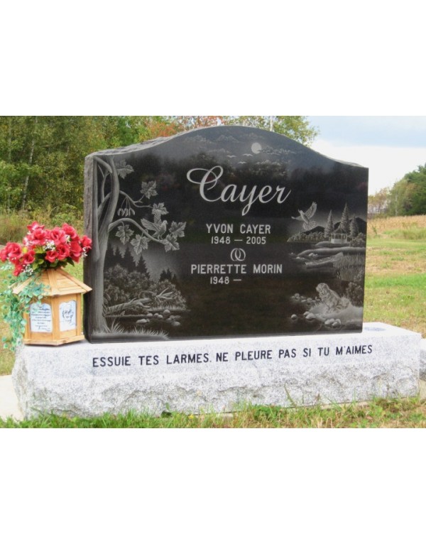 Ce monument funéraire représentant un magnifique paysage de la nature comportant tout ce que lêtre aimé chérissait. Il vous est offert en granit noir, poli en façade et rustique sur les côtés il est tout ce quil y a dunique comme létait la personne chère qui vous a quittée.