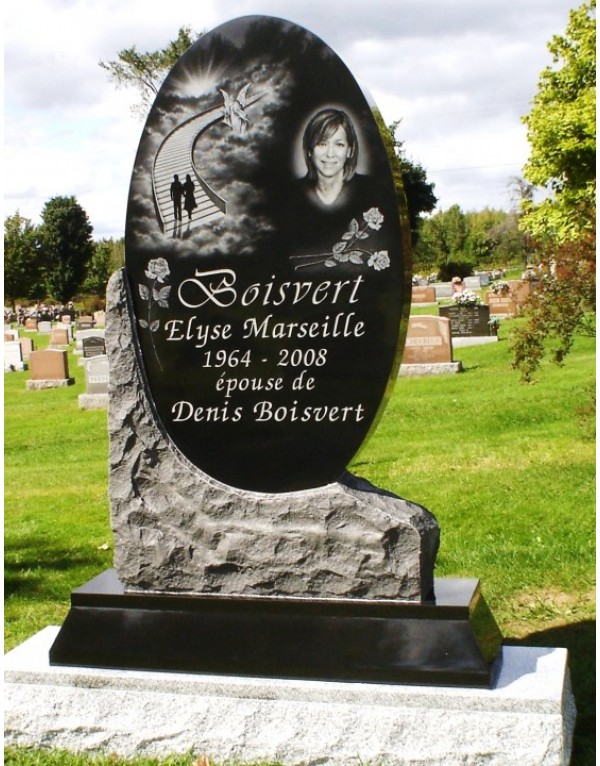 Ce monument funéraire a été conçu pour une personne unique. Ce monument représente un couple uni marchant vers lescalier du paradis, avec sa forme ronde il exprime de belle façon le cycle de la vie. Offert ici dans un granit noir de première qualité, il est poli sur lensemble de sa surface, il repose également sur deux bases de granit dont lune de la même couleur que le monument et la seconde dans une couleur grise afin de bien contraster loeuvre dart.